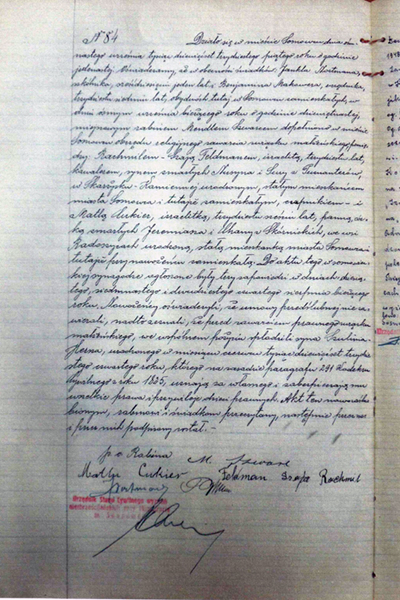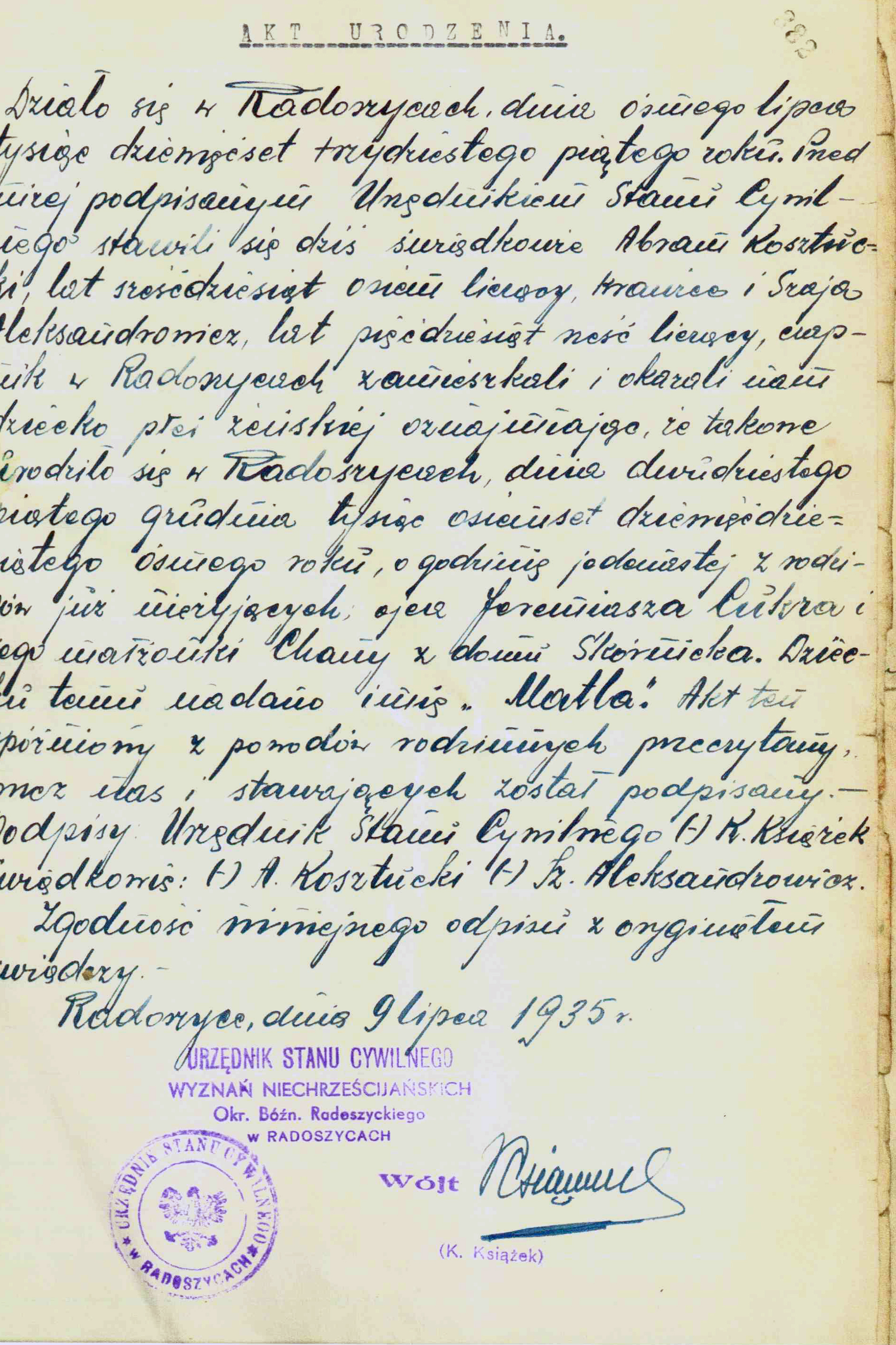 The translation states Rachmil Szaja Feldman, who was 25 years old, a permanent resident of Skarzysko- Kamienna of the Konskie District, but living in Sosnowiec came to report on January 1, 1926 at 9:00 pm Israel Jerimiaz Feldman was born to his wife Matla (nee Cukier) Feldman. The witnesses were Mirle (nee Feldman) Cukier who was 30 years old and a wife of a capmaker and Abram Wolowki who was 27 years old and a tailor.