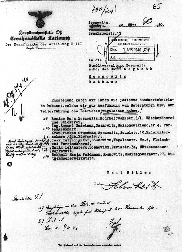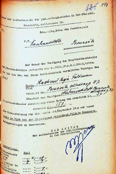 This document is an invoice signed by Monek Merin, the head of the Jewish Judenrat, requesting that the administrator in Sosnowiec pay a total of 150 Reichmarks as employment wages for 30 Jews who were employed by Rachmil Szaja Feldman for the five months (May-September 1940) in the hat company. The money was to be sent by wire transfer to the Judenrats bank account Nr. 7236 in the Sosnowiec branch of the Commerce and Private bank. It also shows on this document that Rachmil Szaja Feldman was living at the time at 27 Modrzejowska street. The letterhead is that of the Judenrat of the Upper East Silesia in Sosnowiec with an address at Marktstrasser 12 (Targowa 12 in Polish).