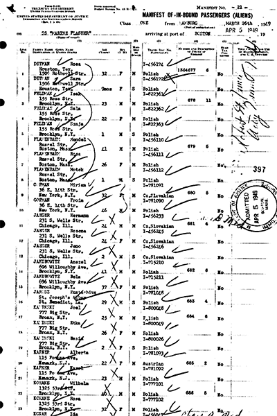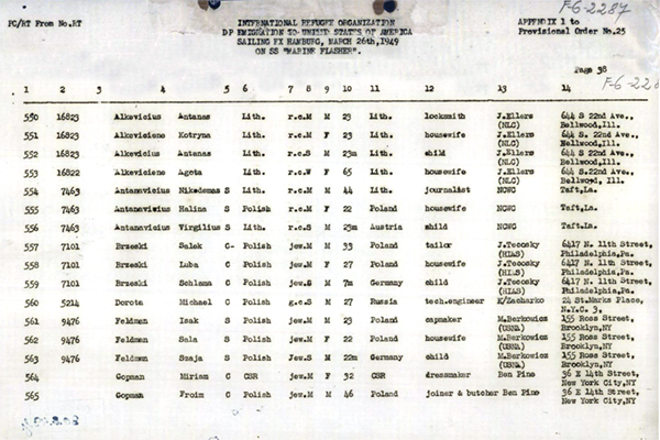 International Refugee Organization's listing of Jack and family aboard the US Marine Flasher