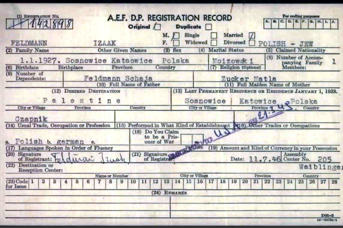 Registrarion card for the Feldafing displaced persons “DP” camp